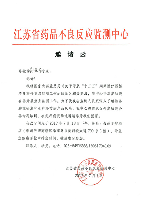 2017年7月13日受江苏省药品不良反应监测中心邀请,我公司研发副总吴惟民先生赴泰州医药城,为参加江苏省贯彻国家食品药品监督管理总局《关于开展“十三五”期间医疗器械不良事件重点检查工作的通知》会议的监管人员,进行皮肤缝合器在研发和生产环节的产品风险培训。根据国家总局的要求,江苏省将在“十三五”期间对皮肤缝合器进行重点监测。参加此次会议的主要有江苏省局医疗器械处、省不良反应监测中心、江苏13个地级市不良反应监测中心等单位的领导和监管人员约30余人。会后大家对吴总的培训给予了高度的评价,认为吴总的培训通俗易懂,让他们了解产品的原理及风险源,为今后的不良反应监测指明了方向。
