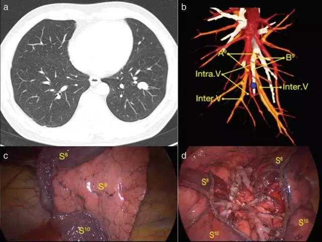 从2013年到2015年,539例结节小于2厘米的非小细胞肺癌病人,接受了全胸腔镜解剖性肺段切除术。术前采用3D-CTBA技术,辨别靶肺段支气管和动脉,以及段内静脉和段间静脉的分布, 明确手术的路径和切除的边界范围,见图a和b。