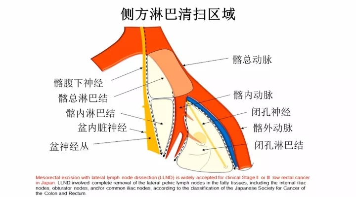根据日本结直肠癌学会分期要求,全直肠系膜切除加侧方淋巴清扫,是治疗临床II期或III期低位直肠癌标准手术。侧方淋巴清扫需要全部切除包含盆腔侧壁淋巴结的脂肪组织,这包括髂内淋巴结、闭孔淋巴结、和/或髂总淋巴结。