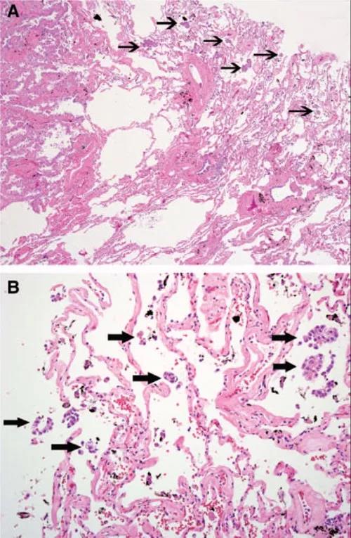 图中展示气道播散(STAS)作为肺癌转移的一种方式。A图中箭头所指STAS癌细胞,存在于肿瘤边界之外的肺实质气道内。B图箭头所指STAS呈微乳头细胞簇群和单个肿瘤细胞。