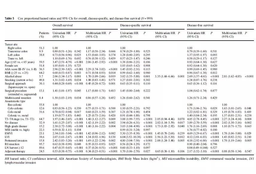 用回顾性研究方法,对从2004年到2014年间做过结肠切除术病人展开研究。应用Cox比例风险模型,对总体生存率(OS)、疾病特异性生存时间(DSS)、以及无病生存时间三项预测因子进行评测。