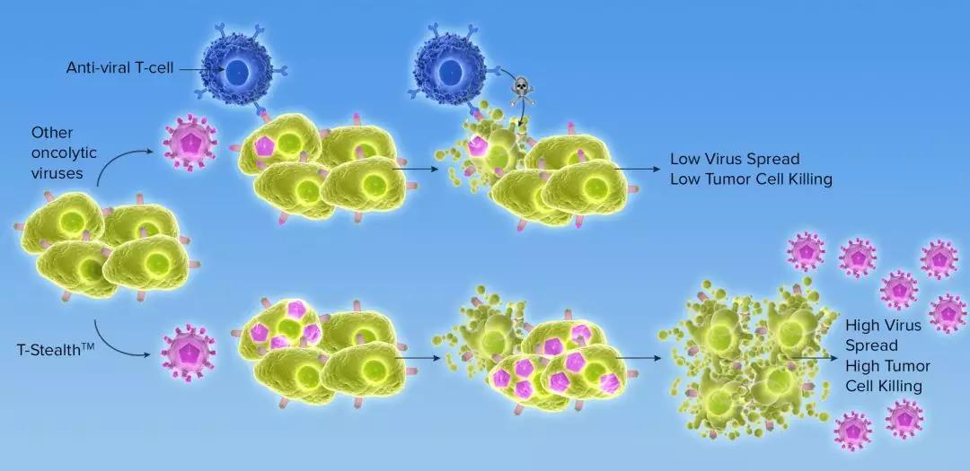 有公司报道,他们发明了一种叫着T隐形病毒(T-Stealth virus)的抗癌病毒,能够躲避抗病毒T细胞攻击,同时可以缓解T隐形病毒和免疫检查点抑制剂之间的对抗关系。这使得T隐形病毒可以和检查点抑制剂同时使用,这种协同能最大化临床效用。(具体原理见下面示意图)
