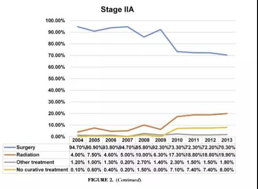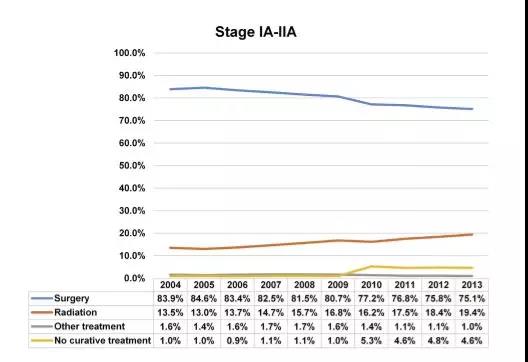 总体手术率为79.8%。所有Ia期到IIa期肺癌病人手术率从2004年的83.9%到2013年下降到75.1%,具有显著差异 (p<0.0001)。其中: