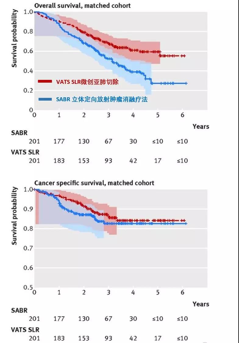 小于2厘米的早期肺癌,在倾向匹配队列研究中,SABR治疗组和VATS SLR治疗组关于总体生存率和肿瘤相关生存率的比较图